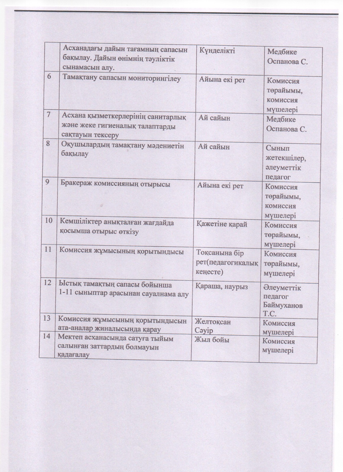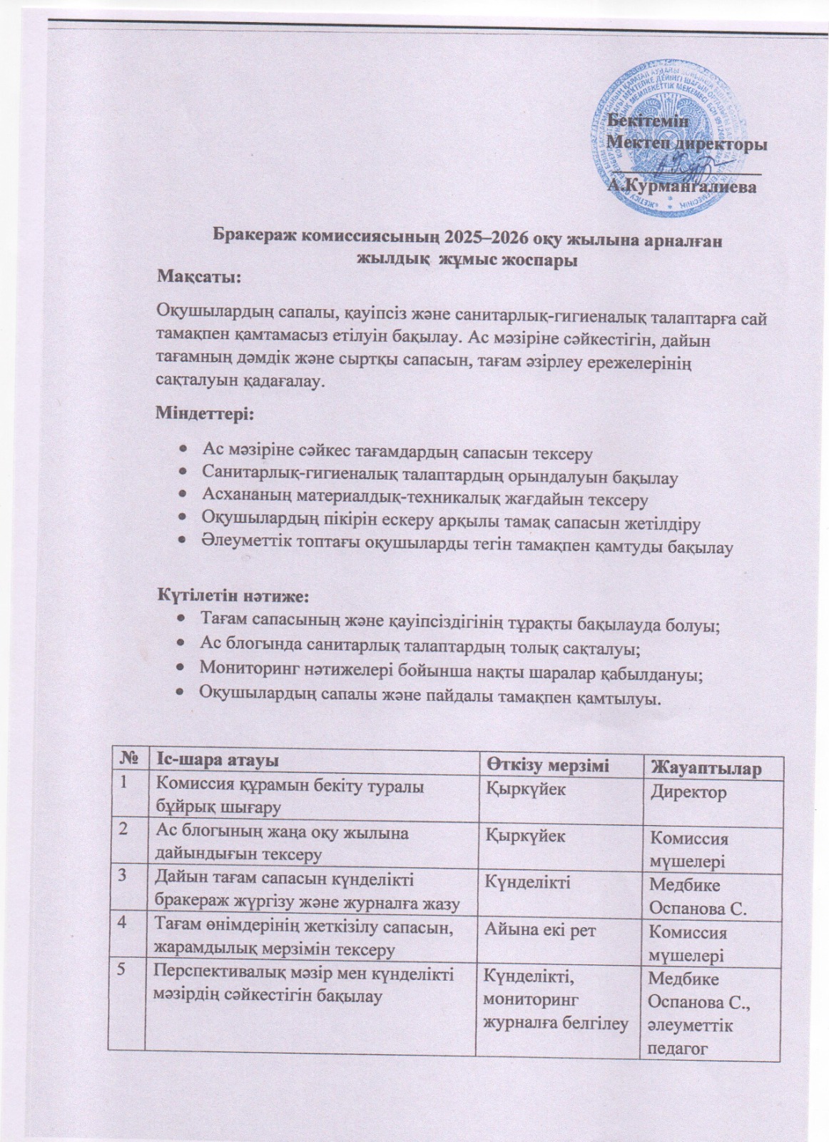 2025-2026 оқу жылына арналған бракираж комиссиясының жылдық жұмыс жоспары. » І.Есенберлин атындағы мектепке дейінгі шағын орталығы бар орта мектеп