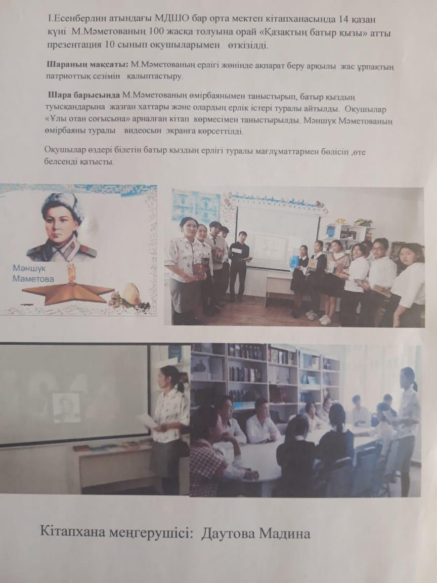 Мәншүк Мәметоваға 100 жыл толуына орай "Қазақтың батыр қызы" » І.Есенберлин атындағы мектепке дейінгі шағын орталығы бар орта мектеп