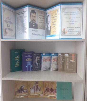 Кітап көрмесіндеАқын –жазушылардың суреттері, ақын –жазушылардың кітаптары,нақыл сөздері,слайд. Ахмет   Байтұрсыновтың суретті, «Тіл – халықтың қазынасы»   тақырбына байланысты кітаптар  , тіл туралы қанатты сөздер, баспасөз басылымдарына шыққан мақалалары