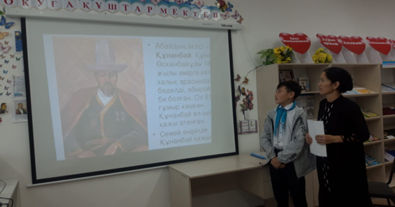 Шара барысында кітапханашы :Қазақтың маңдайына біткен жарық жұлдызы Абай Құнанбайұлының өмірбаянымен таныстырып, ақынның өміріне арналған бейнебаянды оқушылардың назарына ұсынды. Шара соңында кітапханадағы тұрақты кітап көрмесі «Өлмейтін сөз, адаспайтын жол қалдырған дана Абай» атты кітап көрмесімен таныстырылды. 6 сынып оқушылары өте белсенді қатысты.