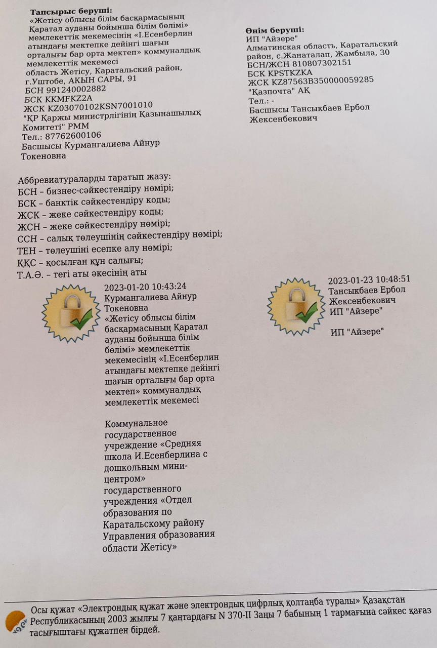 2023-2024 оқу жылы Ыстық тамақпен қамту Келісім шарт » І.Есенберлин атындағы мектепке дейінгі шағын орталығы бар орта мектеп