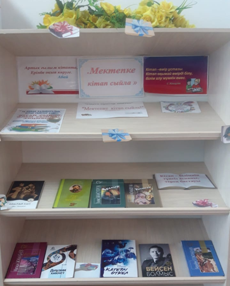 Акцияға 11 сынып оқушылары  ақын-жазушылардың, көркем әдеби  әртүрлі   шығармаларын мектеп кітапханасына сыйлады.Кітапхана қоры: Мағжан Жұмабаевтың,Яссауидың,Бейсен Құранбектің,Ыбырай Алтынсариннің,Әбіш Кекілбаевтың,Ілияс Жансүгіровтың,Ілияс Есенберлиннің ,Бердібек Соқпақбаевтың  әдеби кітаптарымен  толықты.